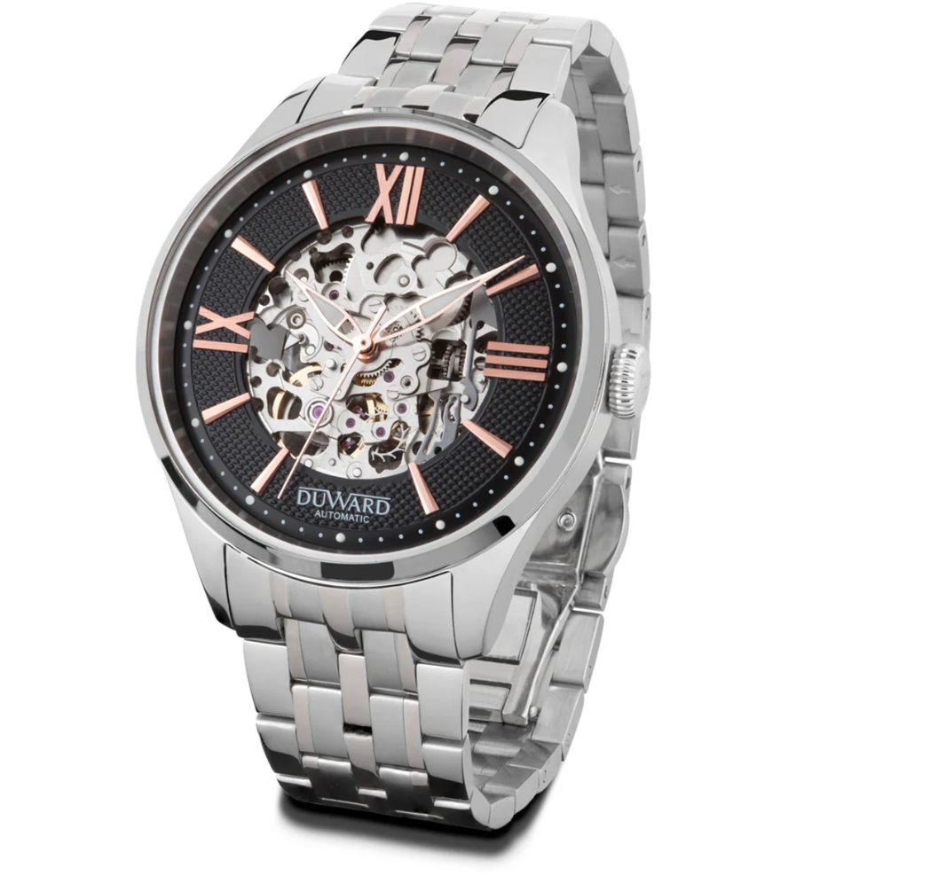 Reloj DUWARD automático de acero para hombre, ideal para el hombre que busca una pieza sofisticada y funcional. La caja de acero 316L, robusta y elegante, se complementa con una esfera negra transparente que deja ver el funcionamiento del mecanismo.